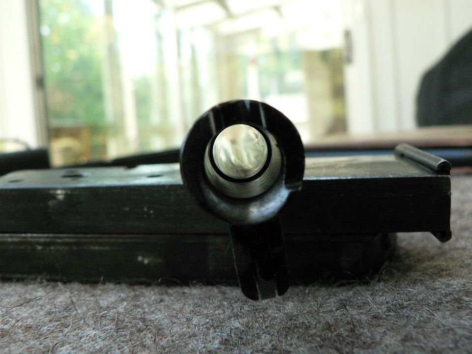 The bore has four grooves. Other than some crud in there from my incompetent cleaning job, the barrel is shiny bright with no wear or frost: