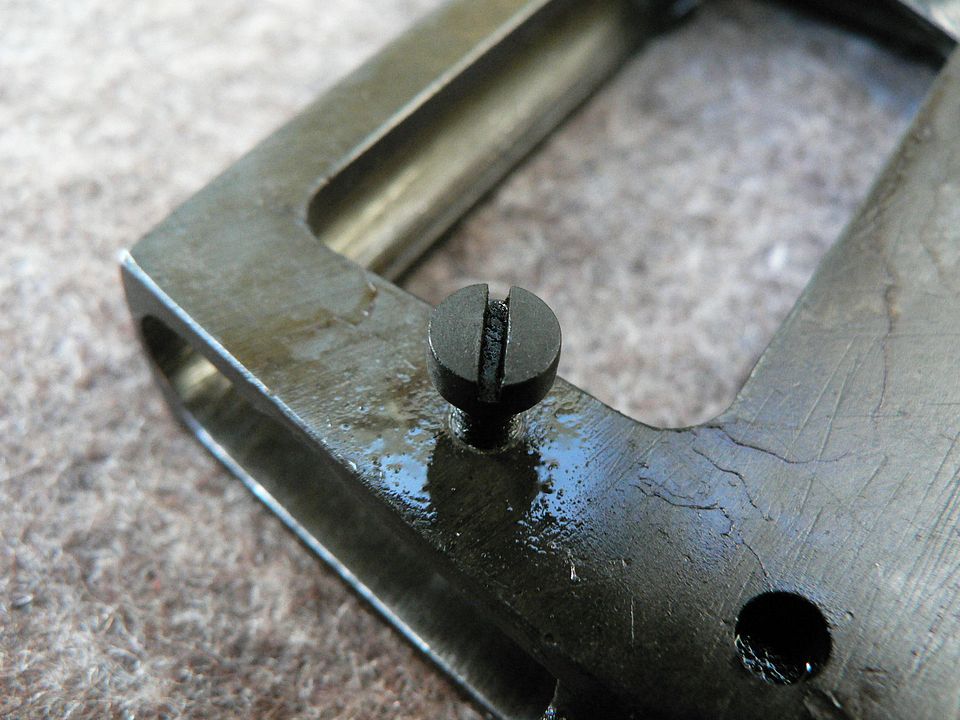 The brown underneath where the grip plates were fitted is not rust; it's dried lubricant. I saw no need to remove it.