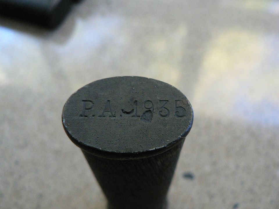 Notice that the stamp is interrupted by the hallmarks. Did the hallmarks come first or did the PA 1935 marking? Did the same company stamp both the hallmarks and the designation marking? Did the straight line marking eventually change to the curved type shown above because of the conflicting stamps? Were previously used 1874 cases repurposed for use with the PA 35? I don't know, do you? Will we ever know? Probably not. I do have some thoughts though and I'll present them later.