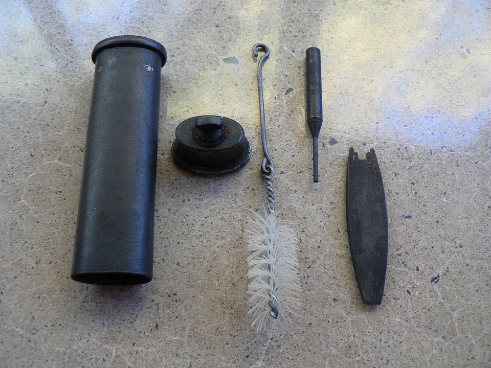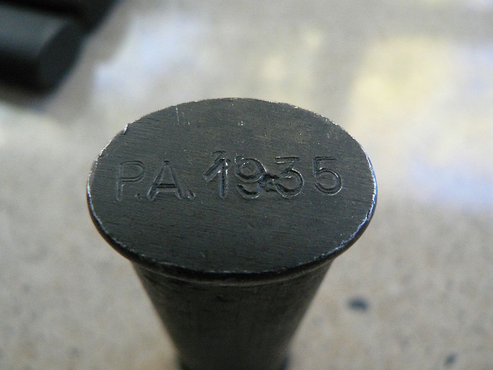 What we are looking at here is referred to in the manuals as the "bottom of the case". While that is true, it is more accurate to say that we are also looking at it the bottom of the cute little oiler that forms the cap for the case. We'll talk a bit more about the oiler shortly. What I want to draw you attentions to here are the three that are marked "P.A. 1935". Notice that all three are marked slightly differently and all three use a different font. As I said earlier, it's clear that more than one company was most likely manufacturing these. At a minimum, more than one company was marking them. Notice too, that four of the five have either inspection or manufacturer stamps on them. This is common on these kits from their first appearance as the Model 1874 kit in.......you guessed it, 1874! It was originally designed for the Model 1873 revolver. The case was the same as we see here but the tools included inside were different. This little gem was apparently quite a hit with the troops and, in short order, it was adapted to all manner of pistols and rifles until finally being abandoned in the late 1950's or early 60's. In every instance, the case was the same, only the tools inside changed to suit the firearm it was intended for. To my knowledge, it's use for the PA 35 is the only instance where the case was marked at the factory for the firearm it was intended for. Sometimes an 1874 kit was numbered to the rifle or pistol it was issued with, sometimes not.