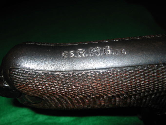 Early serial number 8885 no suffix, Arsenal fitted hold open, All matching numbers. Unit marked 66.RMG.16 serial numbers in commercial style. About 95% original blue and straw. Has a small dent in the side plate. Last two digits on the under side of the side plate. I bought it in a local auction by postal bid, sight unseen! I understand it was captured early in WW1 by a NZ soldier. What do you think? Complete with mag also MG marked, holster and spare mag. Regards Murray.