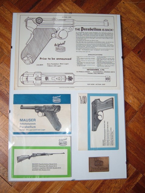 Just finished to set up this nice set for my bureau. It contains some interesting items from Mauser, made in the last years of â??60 first â??70. In fact Mauser in 1964, under the direction of Mr. Adam, the Parabellum and HSc projects got the positive go-ahead. The HSc the more manufacturable of the two took priority. The M66 was already produced but in 1964 Mauser Engineers were really involved in some manufacturing issues related to this rifle. On the top an actual size blue print showing a prototype. Interarms used this blue print as advertising. This is one of the first advertising made by Interarms. Then the manuals of the Mauser Parabellum (first type), M66 and HSc. I guess a nice set. Ciao Mauro