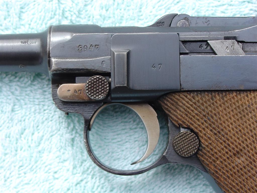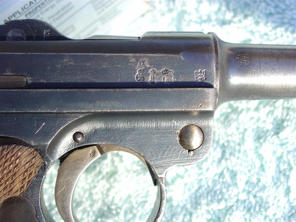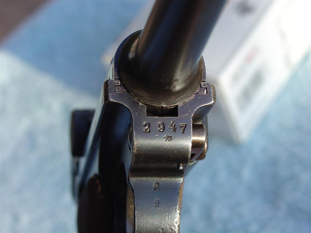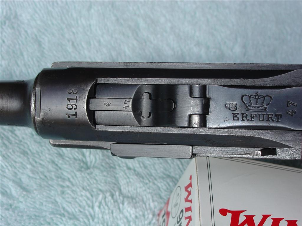 Glen, overall it's a very nice example but I have reservations about that trigger side plate. It's condition appears to be much better than the rest of the metal on the pistol plus it's missing the Erfurt Crown/B stamp. The area just above the 'island' should also show machining marks running front to rear contrary to the rest of the plate shich should be running top to bottom. While it does show the correct number, and in the German style, the die used on the side plate was much newer, showing less use, that the other 47 numbers. I'll probably get bashed for this post by the other guys but that is my initial observation. I agree with Ron on his interpretation of the unit mark.