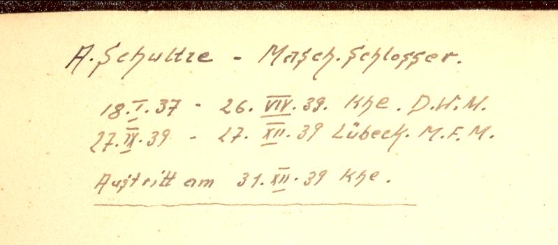 ![]() I recently obtained a copy that could be traced back to the original owner, an Employee of DWM and MfM in the 1930s. A handwritten entry on one of the books first pages reads: ![]() A. Schultze - Masch. Schlosser 18.I.37 - 26.VIV.39 Khe. D.W.M. 27.IX.39 - 27.XII.39 L�¼beck M.f.M. Austritt am 31.XII.39 Khe. Mr. A. Schultze worked as a machine fitter / machine engineer for DWM's branch in Karlsruhe in Baden, Germany from the 18th of January 1937 until the 26th of September, 1939. He was then transferred to the new factory site of DWM and daughter company MfM (Maschinen fur Massenverpackung GmbH) in L�¼beck, where he worked until the 27th of December, 1939. Since he left the company on the 31st of December, 1939, the chance is pretty high that his new employer would have been the German army. Although MfM was originally a company that mainly produced machines for packaging equipment, basically packaging machines themselves, they were also heavily involved in the rearmament of the German nation, as were their parent company DWM (which had reverted to it's old name after being known as BKIW for a number of years). The company site in L�¼beck survived the war without any real problems. The lay-out way such that the individual buildings were scattered across a vast forest area, protecting them against explosions and bombing raids. Furthermore the roof tops were camouflaged using real plants and trees that were placed on top of them. The allied forces had so much problems getting detailed aerial photographs of the complex after the war, that they had large parts of the site deforested. The complex now houses a number of smaller companies and business parks. |