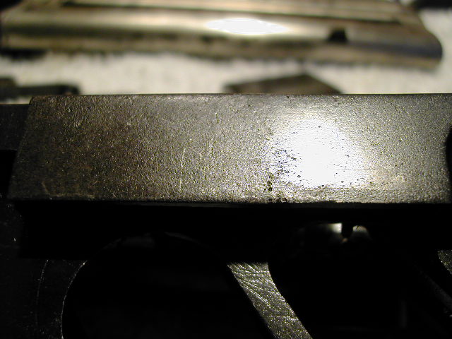 G. van Vlimmeren, what you are seeing in the left side photo is a smooth spot in the otherwise sandblasted appearance of the side rail. It would appear that something had rubbed there and smoothed it out, perhaps the holster. Certainly not the marks left by a torch melting out the solder to remove a brass plate.