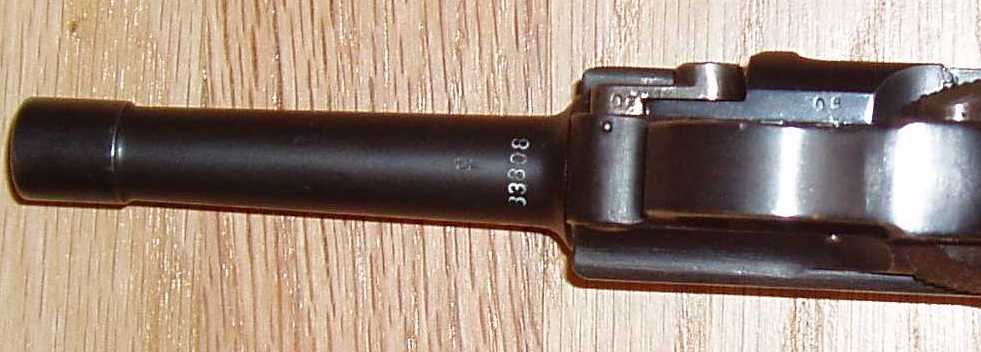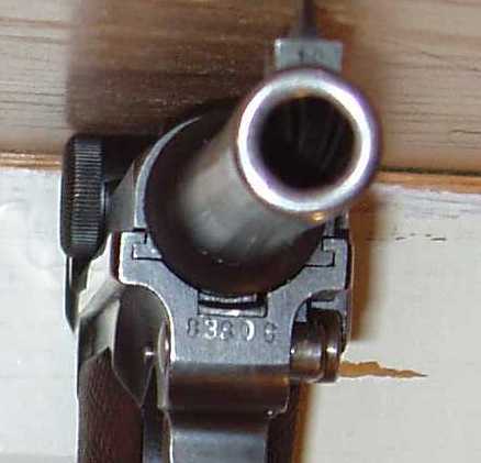 83 21st Ave. San Mateo, CA 94403 650-571-7583, Fax 650-851-2474 Mike is in the store mostly early afternoon. He seems to spend much of the time answering the phone. Now that the address and phone # are out there I don't expect his stock of Lugers to last long. Just leave me first shot at his C-96 Red 9, Zin. 1998 still seems like a short time to have reached such an eclectic group of Luger lovers, or, may I coin a term? 'Lugermaniacs' That is what my wife thinks I am becoming. She could be right! I met her in Taiwan of all places. Here is the frame front serial # as Dwight suggested as well as the bottom of the barrel. A little late, I admit. Looks like he and Ron are correct.
